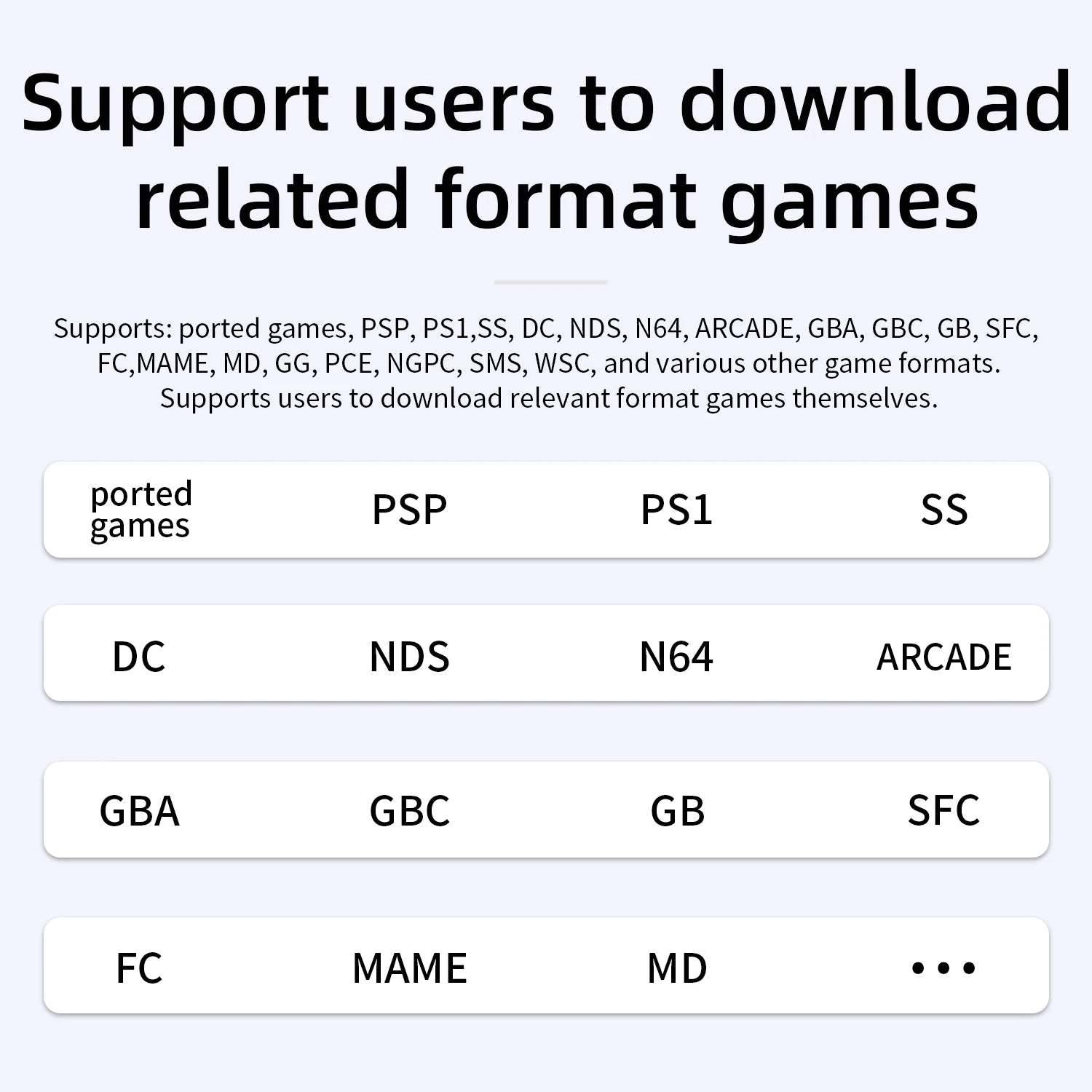 Consola de juegos portátil RG 40XXV, compatible con más de 10 formatos de juegos.ayuda a los usuarios a descargar juegos en los siguientes formatos relacionados.Admite ranuras para tarjetas duales, admite expansión de tarjetas TF, máximo 512 GB.