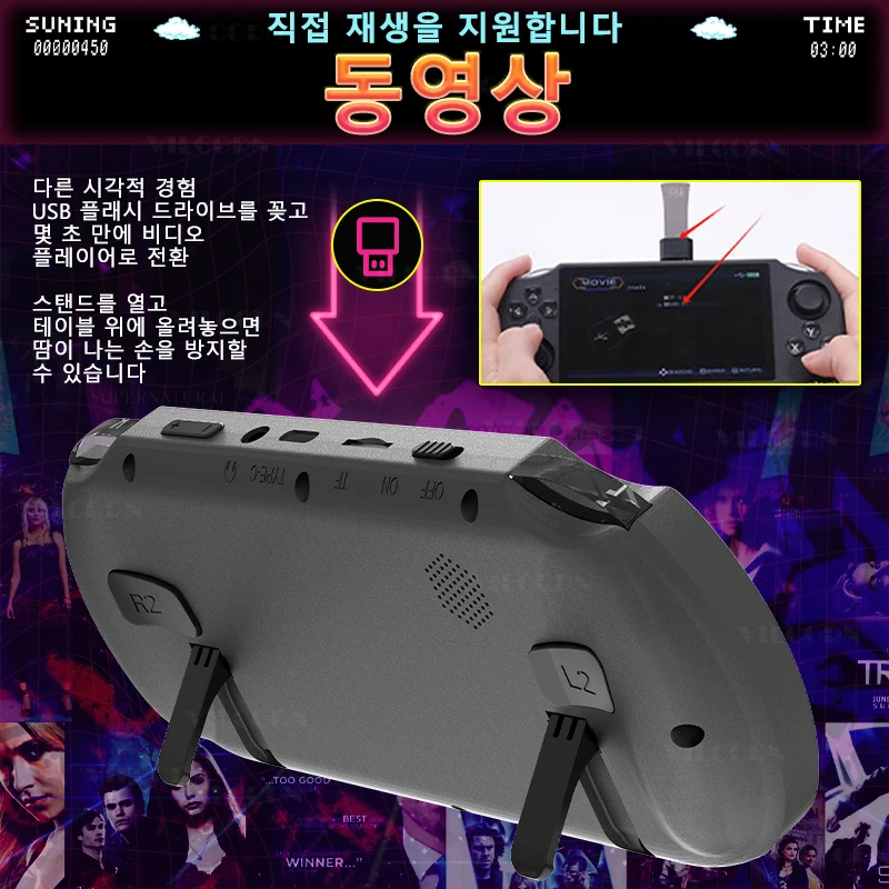 Conecte una unidad flash USB para convertir el dispositivo en un reproductor de video al instante.También incluye un soporte para una fácil visualización y evitar que las manos suden durante el juego.