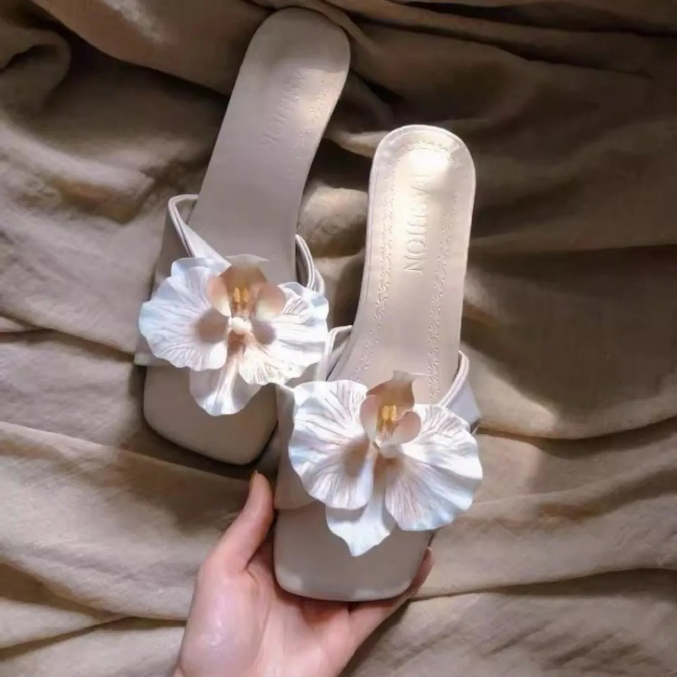 Sandalias de mujer de marca 2025, novedad de verano, sandalias elegantes con flores, ropa exterior informal a la moda, zapatos de tacón alto, sandalias para mujer