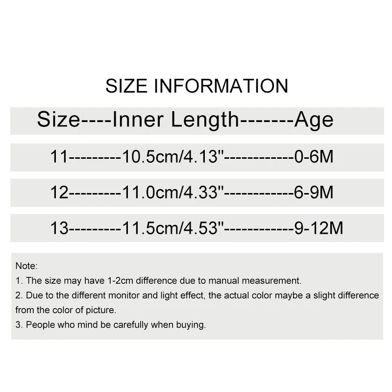 ►Tamaño: adecuado para edades de 0 a 12 meses, los grupos de edad son solo como referencia.Mida primero los pies del bebé y elija el tamaño correcto, consulte nuestra tabla de tallas.