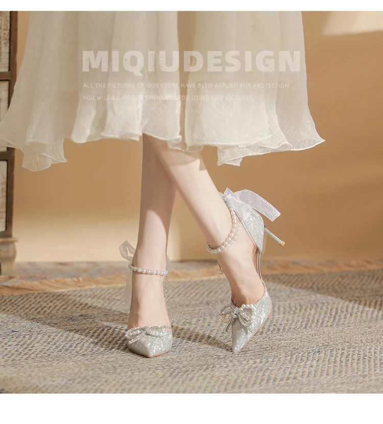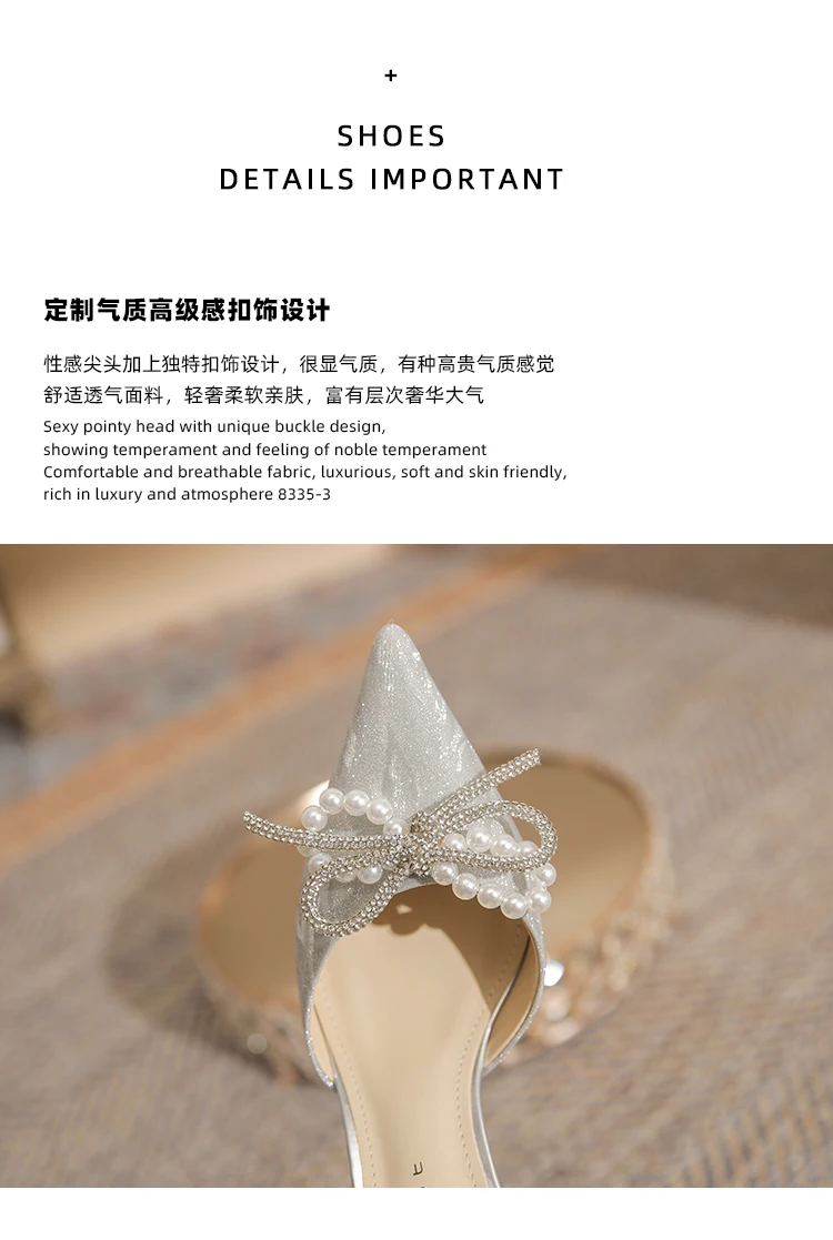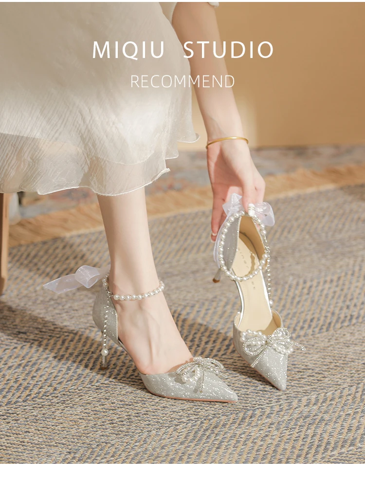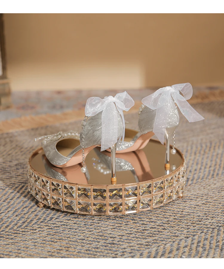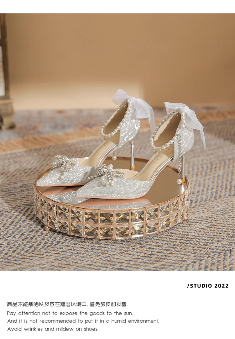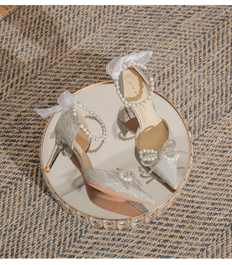 Zapatos de boda para mujer, sandalias de satén con lazo de cristal, zapatos transparentes de tacón alto para fiesta y graduación, 2023